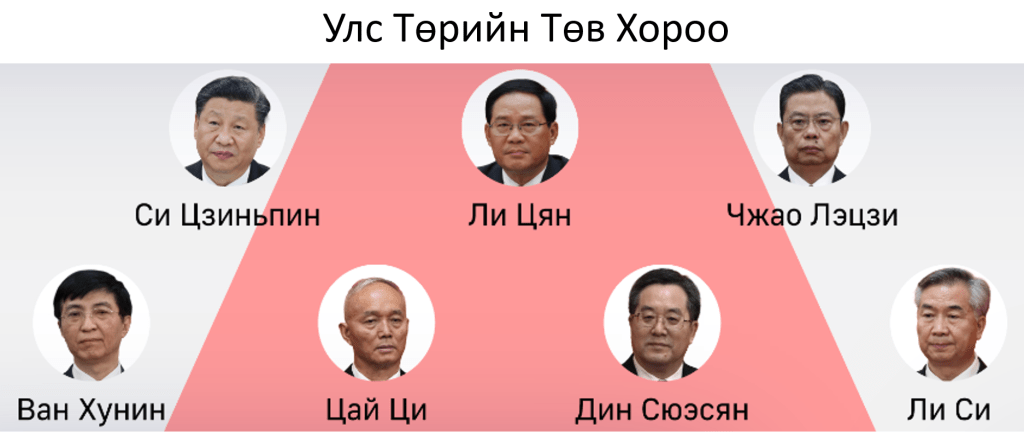 - Улс төрийн төв хороо – байнгын хороо нь долоон хүний бүрэлдэхүүнтэй, (Намын Ерөнхий нарийн бичгийн дарга ордог) намын эрх барих дээд зөвлөл.