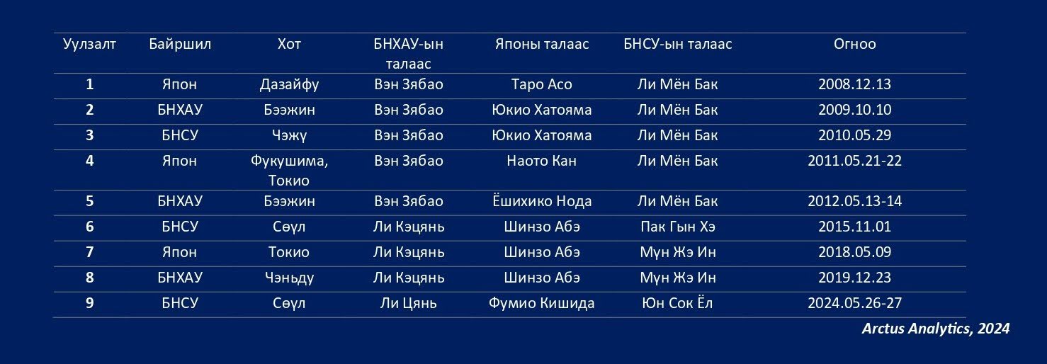 Эх сурвалж: Trilateral Cooperation Secretariat, New York Times, Nikkei Asia, Al Jazeera, Global Times, the Diplomat.