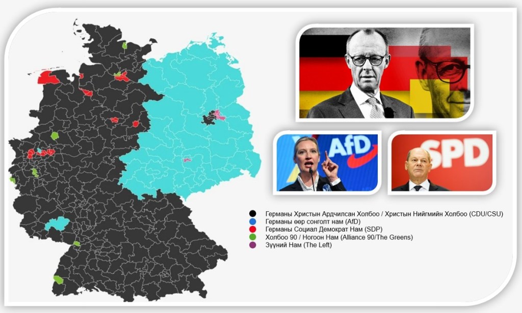 Консерватив Христийн Ардчилсан Холбоо (CDU)-ын дарга Фридрих Мерц сонгуулийн дүнгээр Германы дараагийн канцлер болох нь тодорхой болж байна. Фридрих Мерцийн ялалт нь 12 жилийн завсарлага авсны дараах улс төрийн томоохон эргэн ирэлт боллоо. Ф.Мерц нь консерватив үзэлтэн бөгөөд SPD-тай тэмцэхээр өөрийгөө байршуулж, намынхаа консерватив болон Христийн ардчилсан үнэт зүйлсийг тусгах нь гарцаагүй.