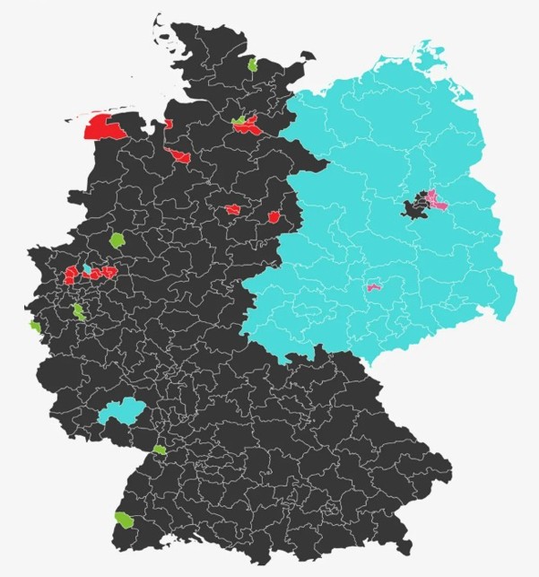 Харин одоо бол Зүүн Германд ихэнх хэсэг нь AfD-гийн цайвар цэнхэр өнгөөр будагдсан бол Берлин, Лайпцигийн хагас зэрэг цөөн хэдэн бүс л өөр өнгөтэй байна. Харин баруунд ихэнх нутаг консерватив хар өнгөтэй бөгөөд ялангуяа Бавари дахь CSU (ХБНГУ-ын сөрөг хүчний удирдагч Фридрих Мерцийн консерватив нам) давамгайлж байна.