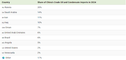 БНХАУ нийт хэрэглээнийхээ 70 орчим хувийг импортолж, үлдсэнийг дотоодоос хангадаг. Импортын хамаарлыг багасгахын тулд нэг улсаас импортлох хэмжээг нийт импортын 15 хувиас хэтрүүлэхгүй байх бодлого баримтлах болсон нь 2003 онд АНУ-ын Иракт явуулсан цэргийн үйл ажиллагааны улмаас БНХАУ-ын Ирак Улсаас импортлох газрын тосны нийлүүлэлт тасалдсантай холбоотой юм. Харин ОХУ-ын хувьд хоёр улс “хязгааргүй түншлэлийн” харилцаатай тул импортын хязгаарлалтгүй болно.