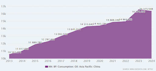 Тус улсын газрын тосны хэрэглээ 2023 он хүртэл өссөн ч 2024 оноос эхлэн буурч эхэлсэн нь тээврийн хэрэгсэлд шаардагдах газрын тосны хэрэглээ буурсан, мөн эрчим хүчний эх үүсвэрийг төрөлжүүлж чадсантай зэрэгтэй холбон тайлбарлаж болно.